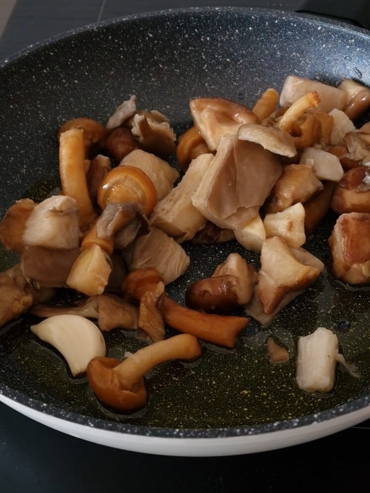 • Start by cleaning the mushrooms, then sauté them in a pan with a clove of garlic and oil.