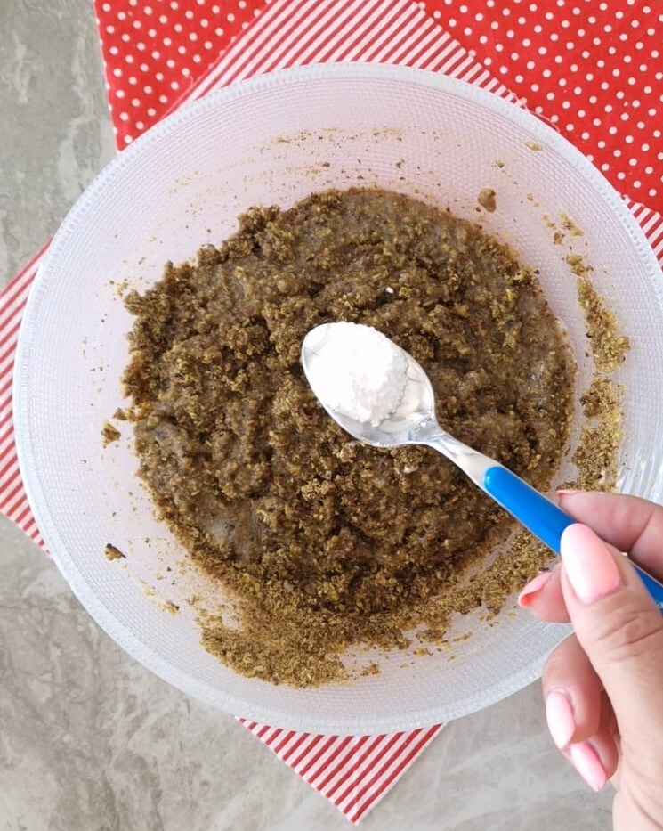 In the meantime, sift the baking powder together with the pistachio flour and combine all ingredients.