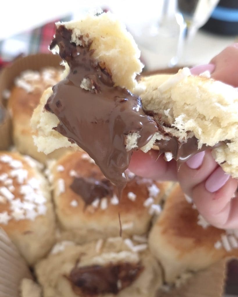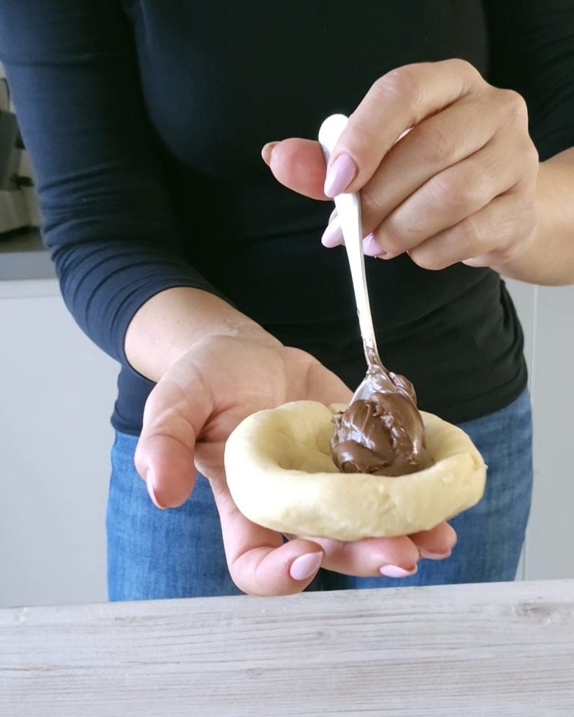 • After the resting time, divide the dough into 6 equal balls, which should be filled as follows: “Slightly open each ball with your hands, add a generous tablespoon of Nutella and then close the ball on itself“.