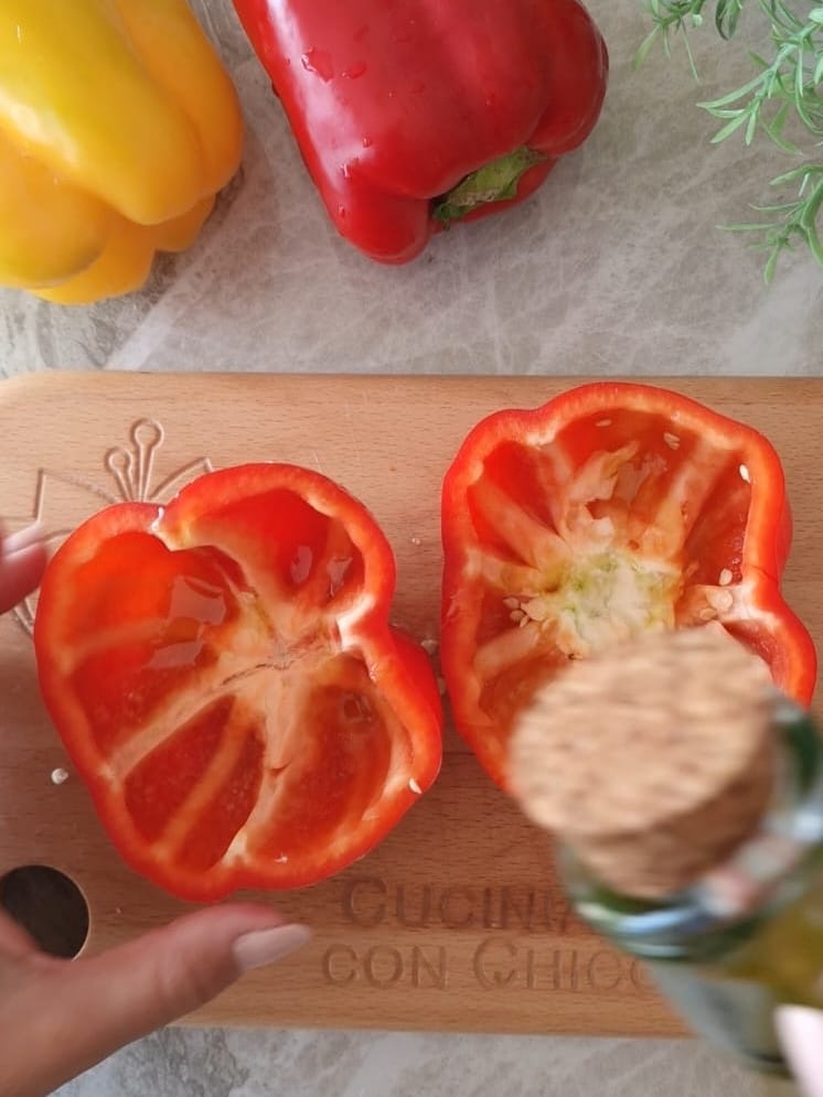 • Wash the bell peppers, then cut them in half, remove the seeds and the harder parts. Season them with a drizzle of extra virgin olive oil and set them aside.