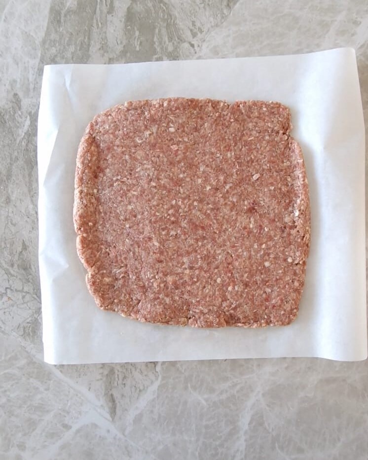 Transfer everything to the work surface and with the help of two sheets of parchment paper, one on top and one below, use a rolling pin to flatten the meat into a rectangle.