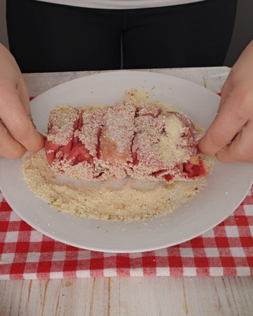 • Repeat this step for all the meat slices you have. Mix the breadcrumbs with a spice mix.