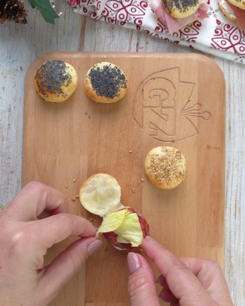 • Remove from the oven and let them cool slightly, then divide them in half and stuff with: salami and spreadable cheese and a lettuce leaf, or with mayonnaise and prosciutto, or with cooked ham, but also with salmon and spreadable cheese or mayonnaise.