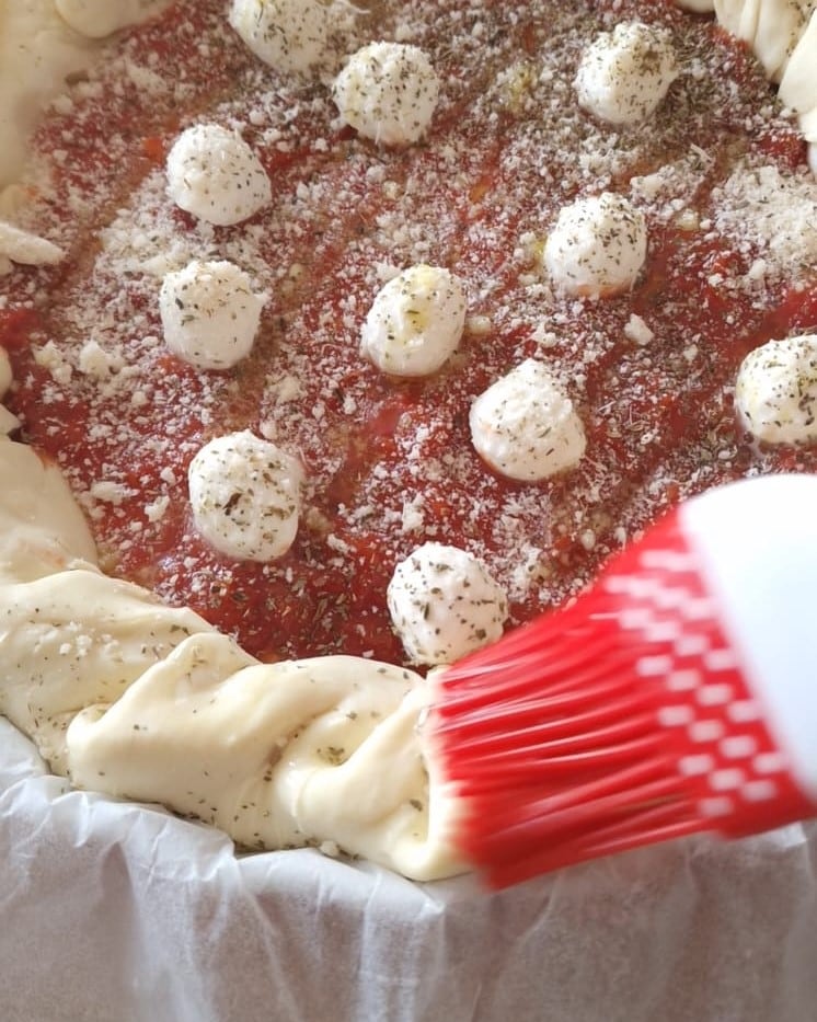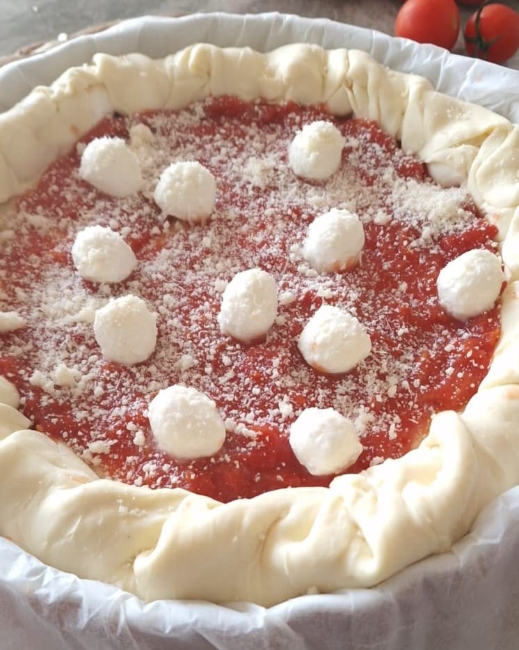• At this point, fill the center with the tomato sauce, mozzarella, and Parmesan cheese.