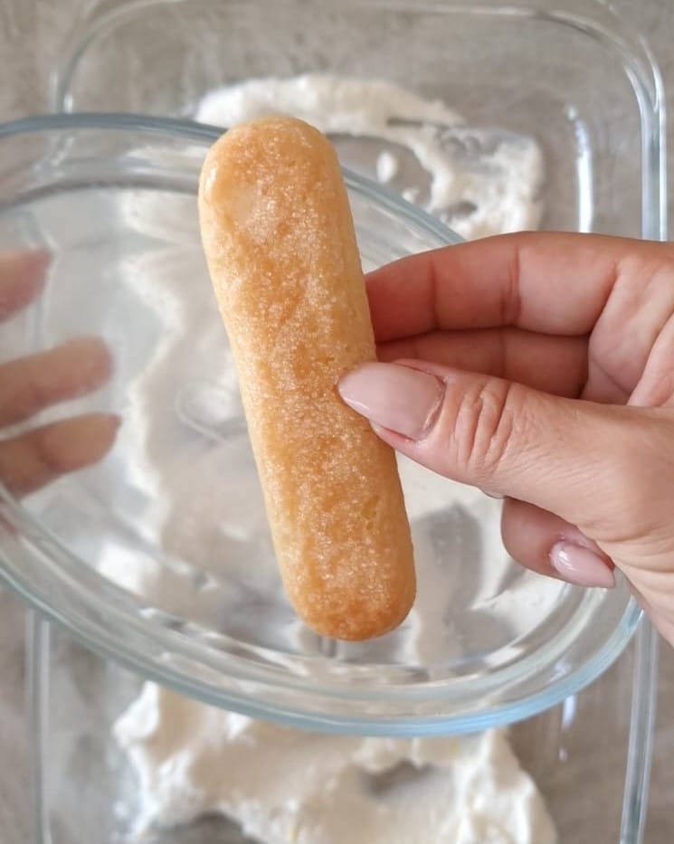 • Soak the cookies in the syrup and then in a baking dish alternate layers of cookies and cream.