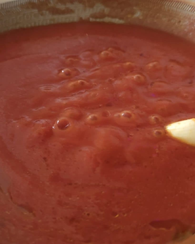 • Then pour in the tomato sauce and season with a pinch of salt, continue cooking for another 10 minutes.