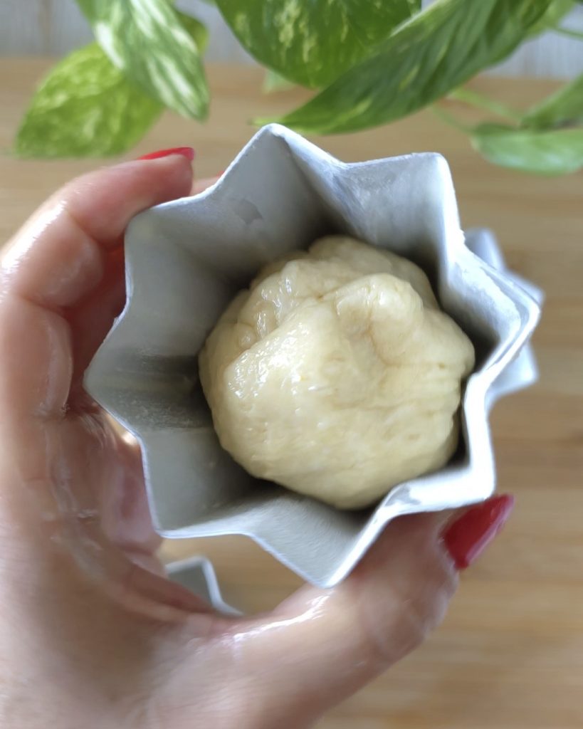 • Deflate the dough, and with well-oiled hands, shape 12 balls and place them inside the pandoro molds. Let them rise for about 20 minutes covered with a dish towel.
