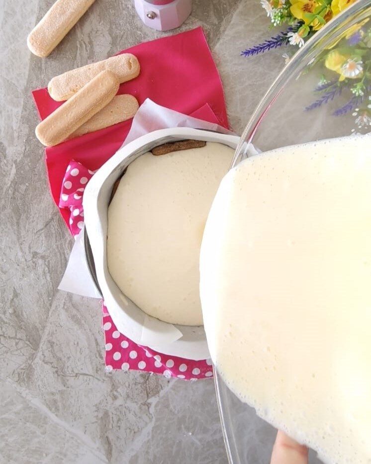 • Take an 8-inch pan and line the sides and bottom with parchment paper, then cover the base with the coffee-soaked biscuits.