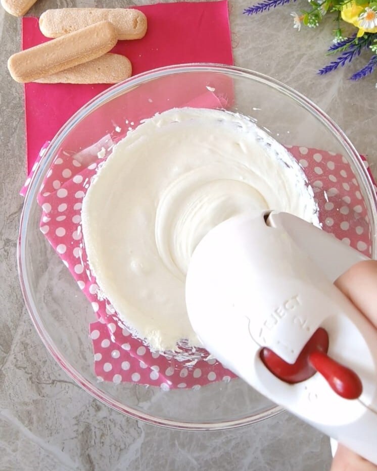 • In a bowl, place the mascarpone and sugar, and mix with an electric mixer.