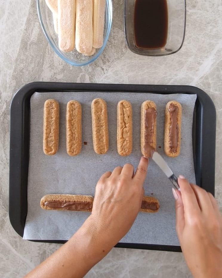 • Take half of the ladyfingers and dip them in the coffee on the inner side only, for just a moment—do not soak them too much.