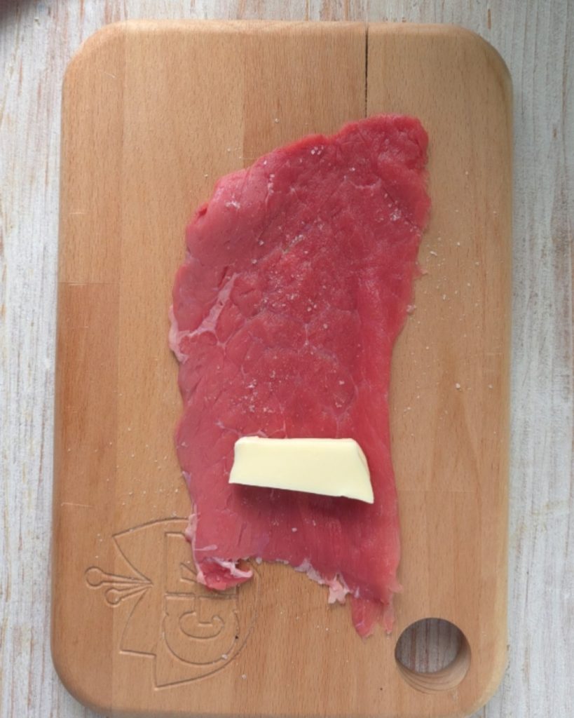 Place the slices on a cutting board, and if the meat slices are too thick, pound them with a meat mallet. Then season with a pinch of salt and fill with the scamorza cheese.