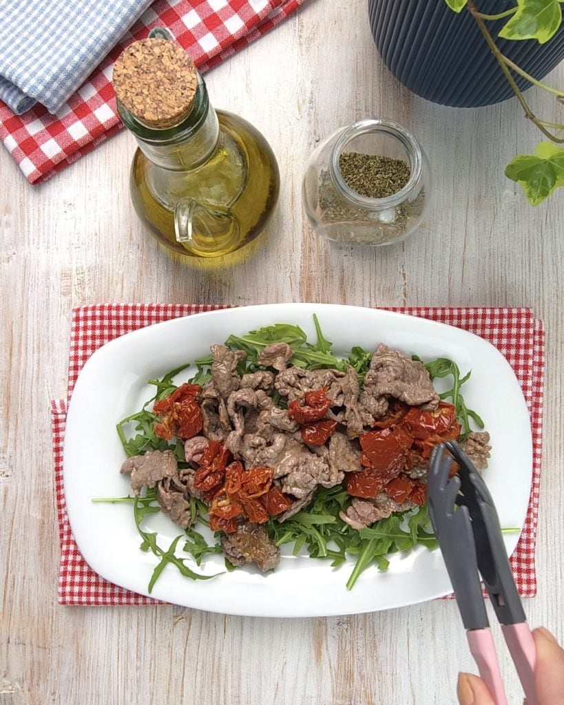 Veal Strips with Arugula, an easy and quick recipe, highly appreciated for its pleasant taste. This is a summer recipe very similar to veal strips with mushrooms and beef strips with peas. The meat is cut into strips and cooked in a pan with various seasonings, then sun-dried tomatoes, arugula, and Grana cheese are added. It’s a really special second course, a great solution for those looking for a light recipe ready in 15 minutes!