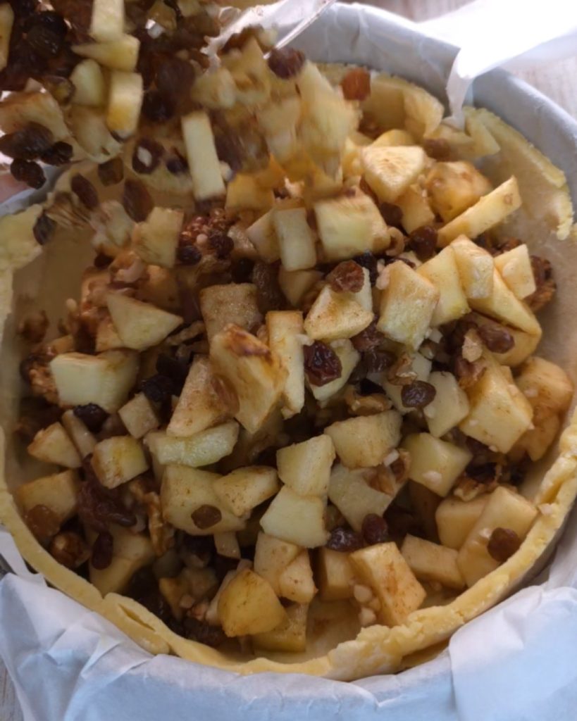 Cut the apples into pieces, then drizzle them with lemon juice. In a bowl, add the nuts, crumbled cookies, sugar, and previously soaked raisins, and mix everything together.