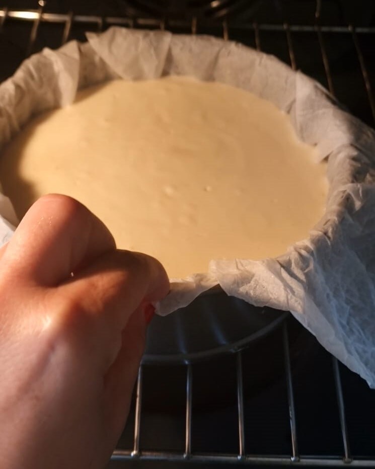 Take a 8-inch springform pan, covered with parchment paper, and pour the mixture into it. (for better adherence to the pan, you can wet the parchment paper under running water and squeeze it with your hands).