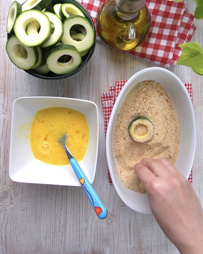 Then dip the zucchini rings first in the eggs and finally in the breadcrumbs mixed with salt and garlic