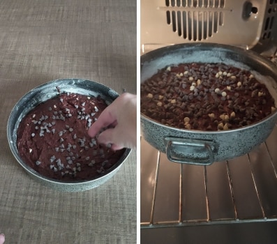 – Grease and flour the cake pan, then fill it with the batter and decorate the surface with chocolate chips.