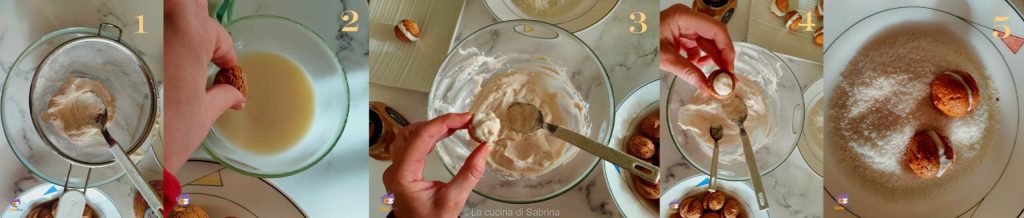 – Pour the coconut flour into a tray or flat plate and roll the coconut amaretti kisses.