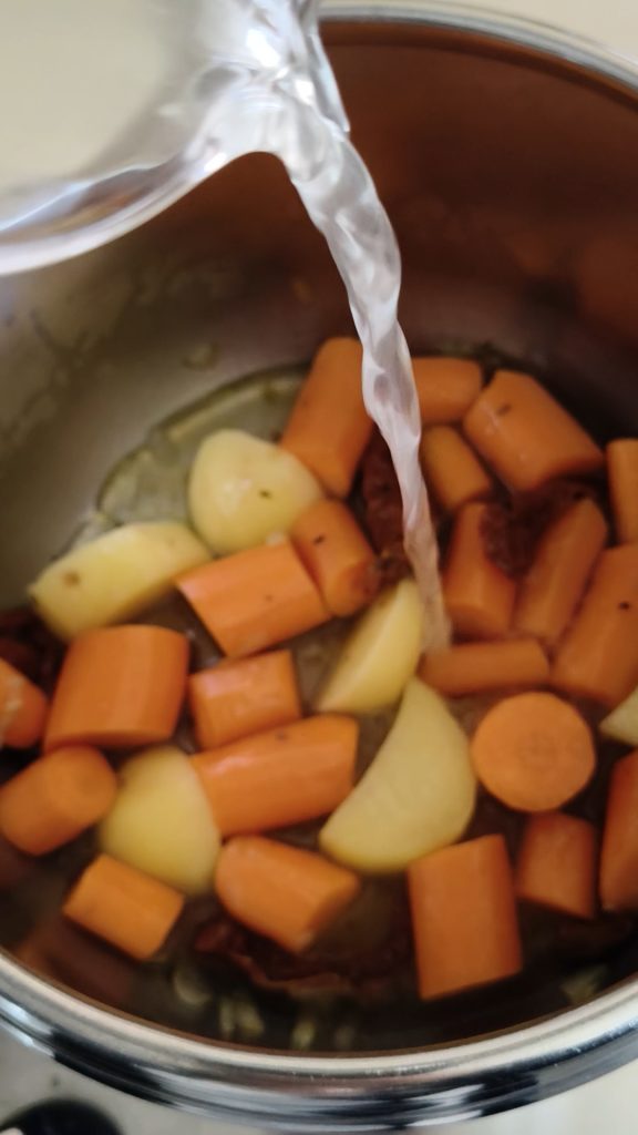 Wash, trim, scrape, and cut the carrots into pieces; peel and cut the potato and add to the sauté. Also add the sun-dried tomatoes and stir to flavor.