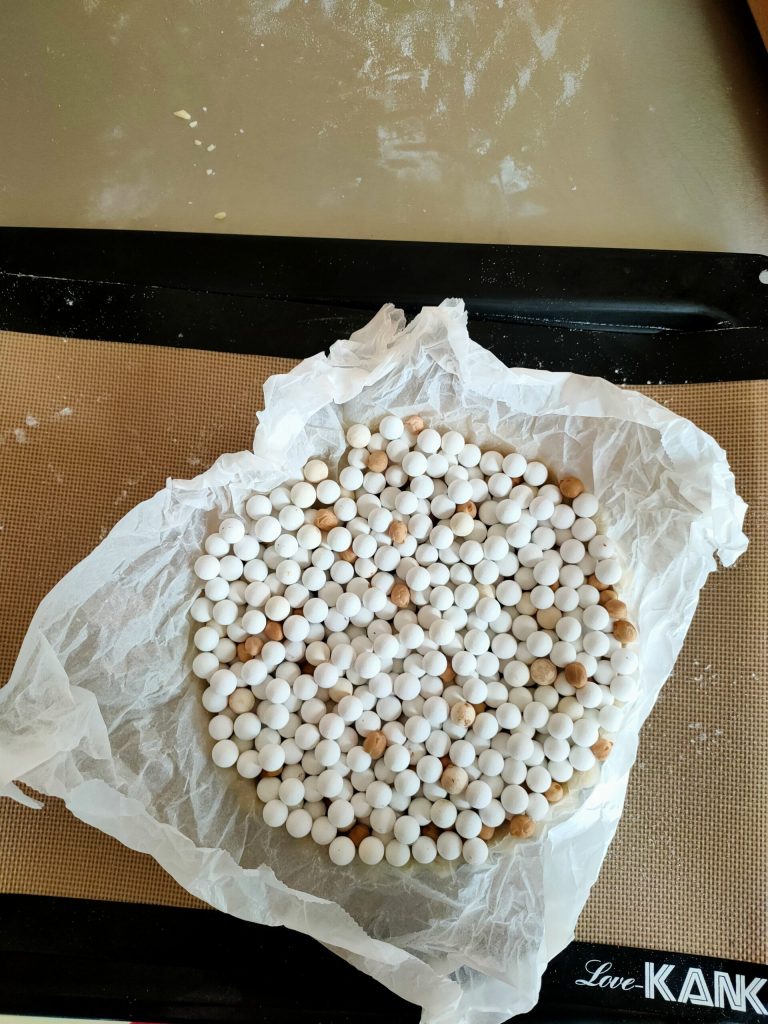 – Roll out the pastry on the disk/grid following the package instructions; or check online, you’ll find many tutorials. The important thing is to flour the grid well and freeze it.