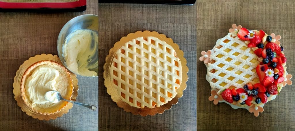 – Pour the custard cream into the shortcrust shell, gently place the lattice, and position the fresh fruit, washed and dried. Dust with plenty of powdered sugar.