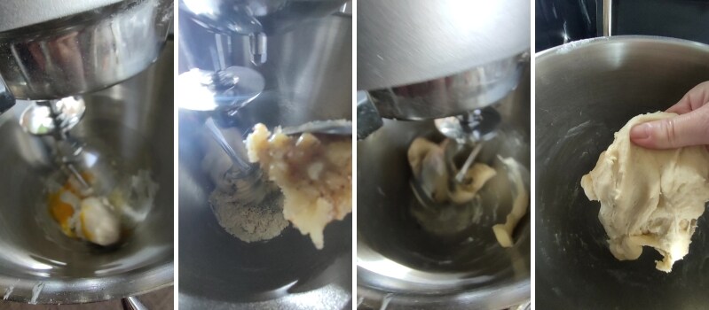 As soon as you see that the stand mixer is struggling to turn, add the egg, sugar, and remaining flour.