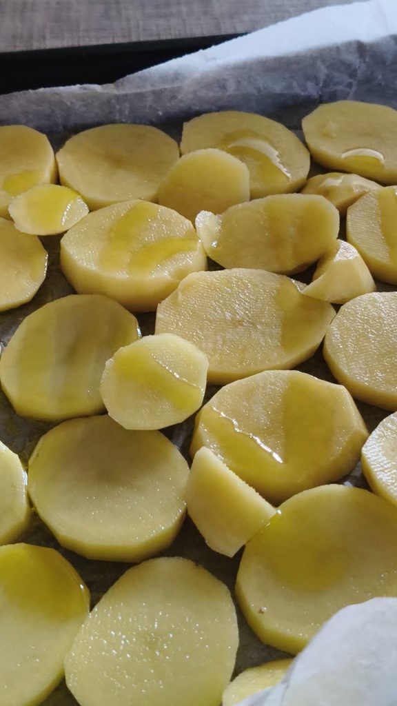 • Slice the potatoes not too thin after washing and peeling them, and place them in the pan lined with lightly oiled parchment paper underneath, trying not to leave empty spaces. Season with oil and a pinch of salt and bake in a preheated oven at 375°F for about 20 minutes.