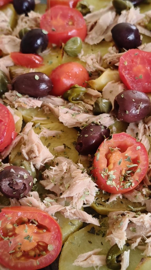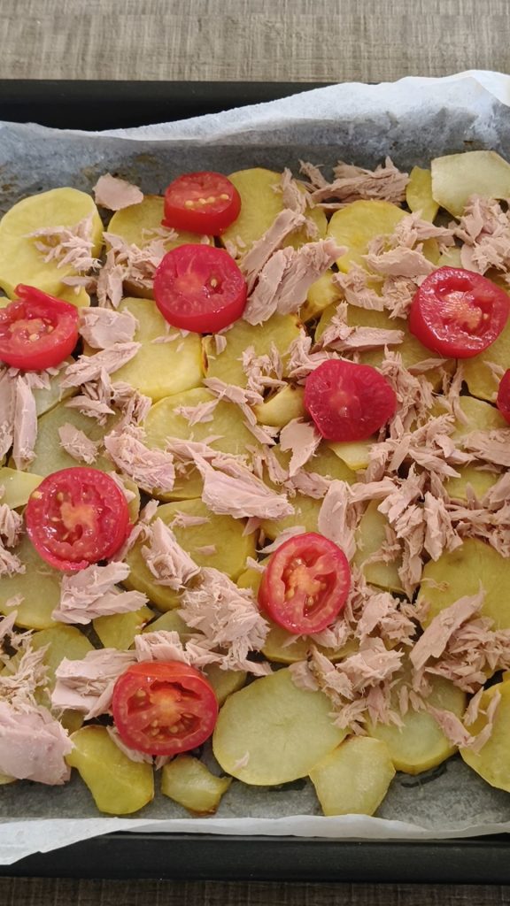 The recipe is very easy and consists of potatoes, canned tuna in oil, tomatoes, and herbs… all in the oven or air fryer and then on the table!