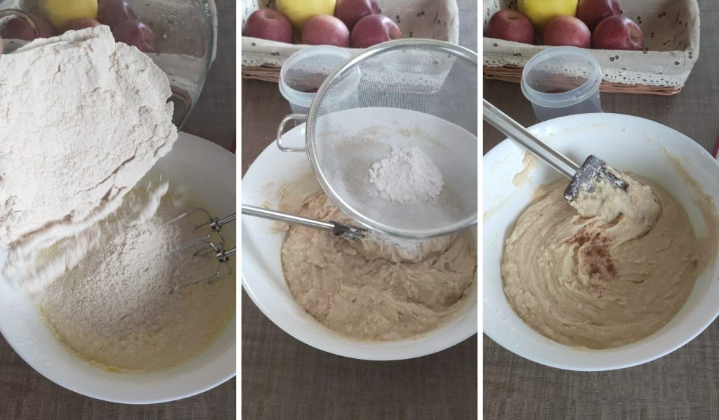 – Pour in the previously sifted flour and (if you deem it necessary, mix with a spatula to avoid flour spreading) mix, then add the baking powder sifting it directly into the bowl and a pinch of cinnamon.