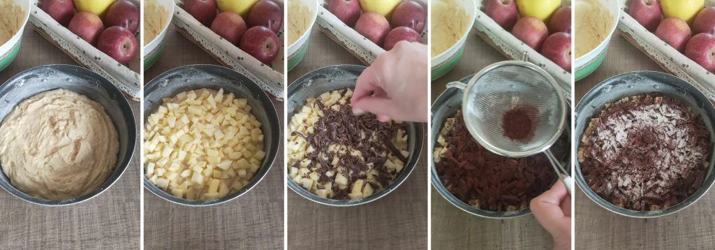 – Pour about half of the batter into the greased and floured cake pan and distribute diced apples on top, (raisins if used) the chopped dark chocolate, a sprinkle of cocoa, and sifted powdered sugar directly over the chocolate.