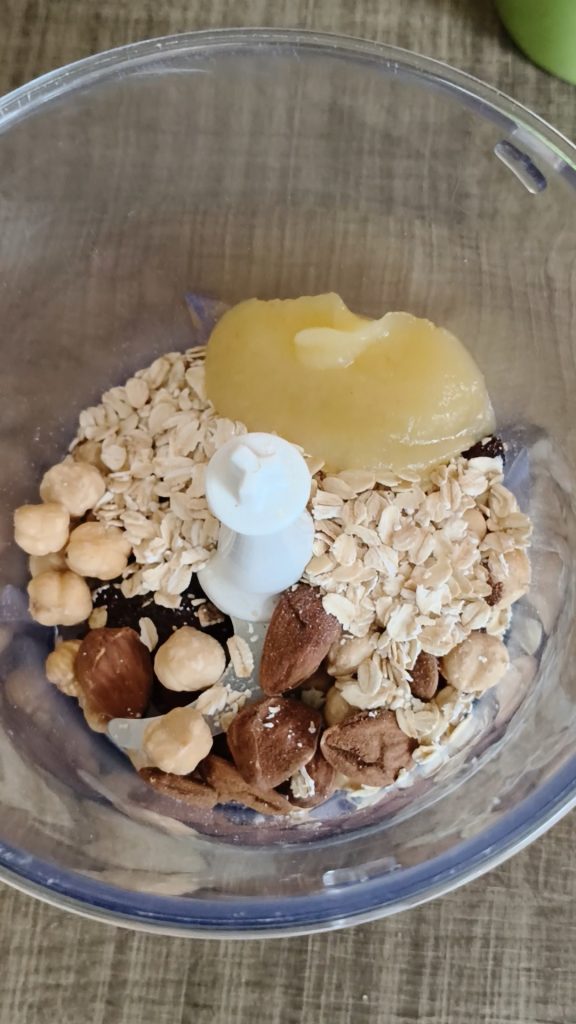 Place the nuts, pitted dates, a tablespoon of oat flakes, the oil, and the apple sauce in the blender cup. Pulse to roughly chop the dates and nuts and mix.