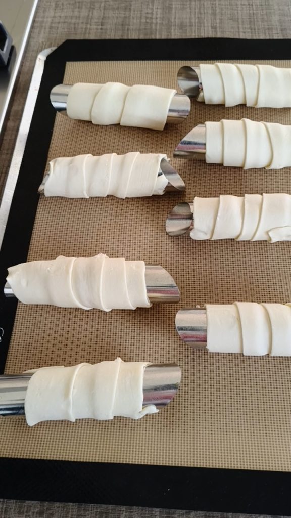Unroll the puff pastry and cut 8 strips about 2 cm wide. Wrap each strip around a mold, being careful not to stretch the dough and slightly overlapping. No need to grease the molds.