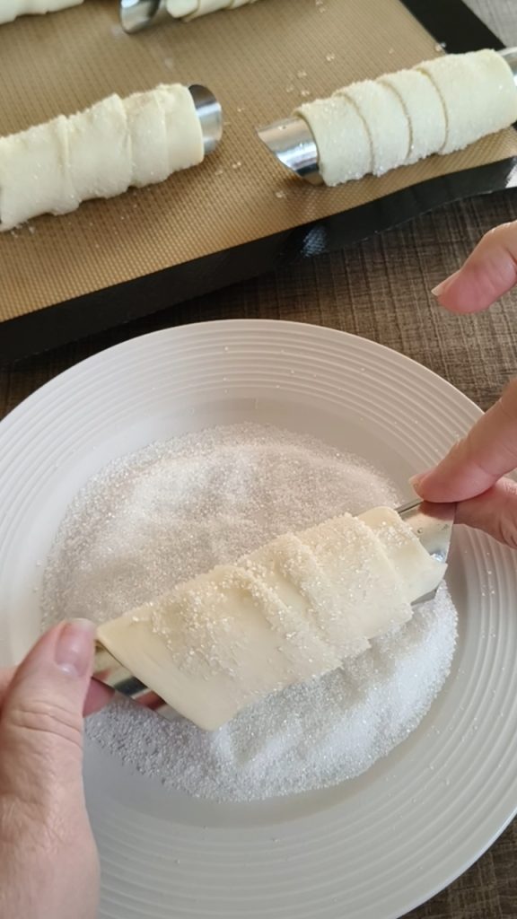 Place some granulated sugar on a tray or flat plate and roll the previously brushed molds. Bake in the oven for about 12-15 minutes (they should be golden).