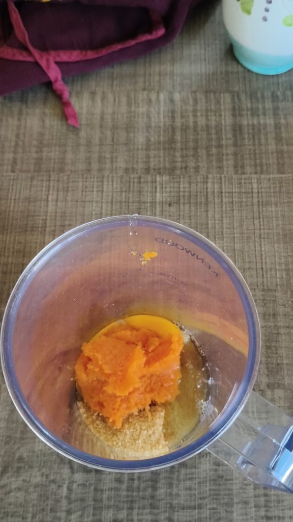 Place the brown sugar, egg, and pumpkin flesh in the immersion blender cup. Blend for a few seconds.