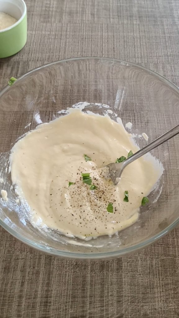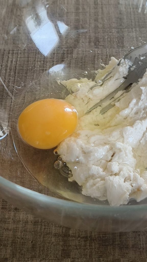 In a bowl, mash the almond ricotta, add the egg and combine the two ingredients with a fork.