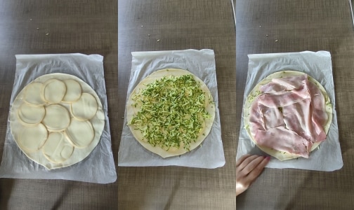 – Unroll the pastry and cover it with slices of smoked provolone; grate the zucchini into julienne strips directly onto the cheese slices and finish with the ham slices.