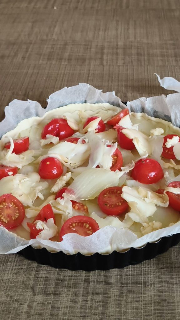 • Fill the puff pastry with fennel, cherry tomatoes, and smoked scamorza cheese, trying to distribute the ingredients evenly.