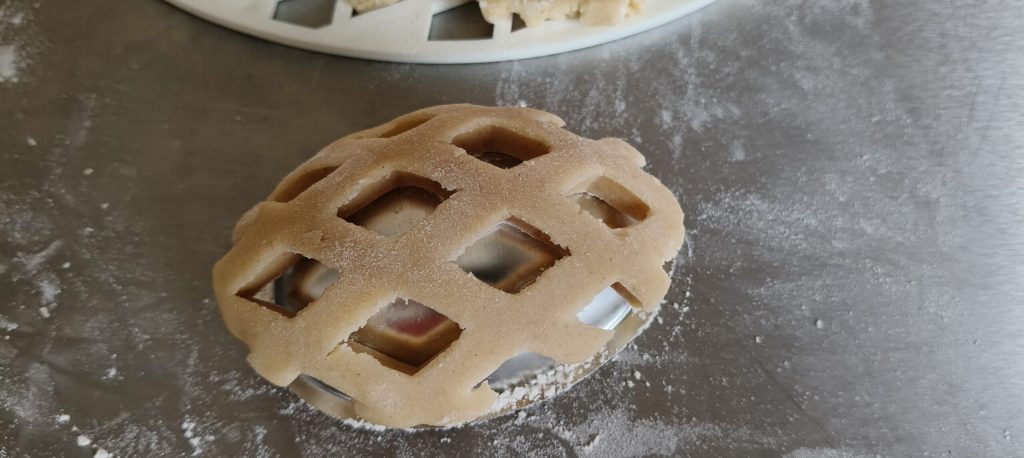 Roll out part of the shortcrust pastry to a thickness of about 2 mm and position it on the tart lattice following the instructions. Place in the freezer for 3/4 minutes.