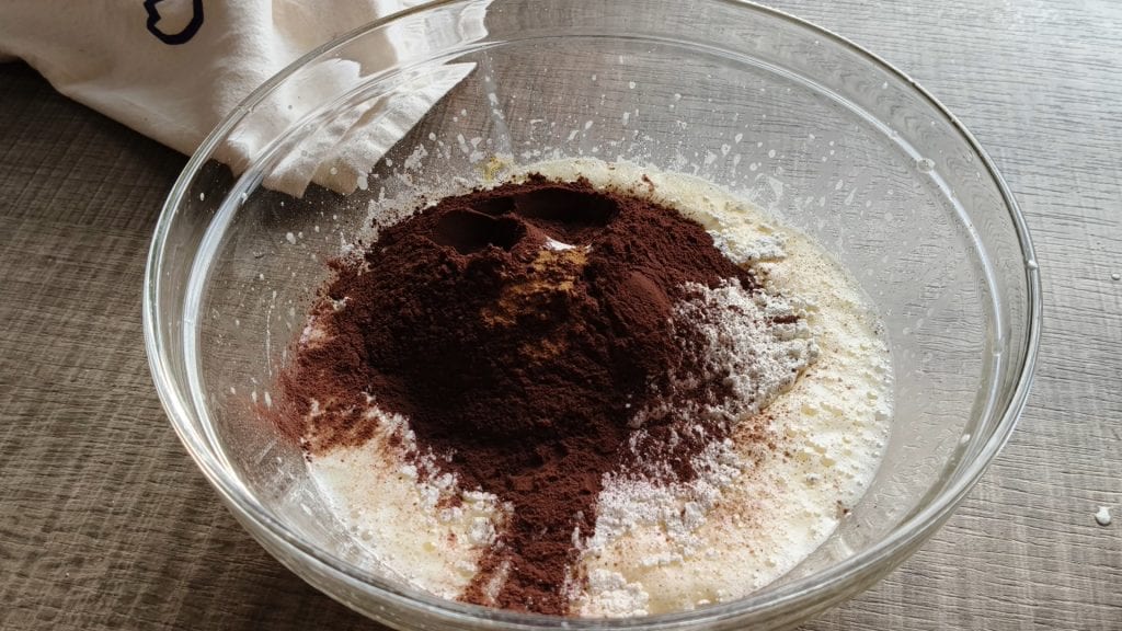 Sift the flour to remove impurities and add to the batter along with the baking powder, cocoa, and cinnamon.