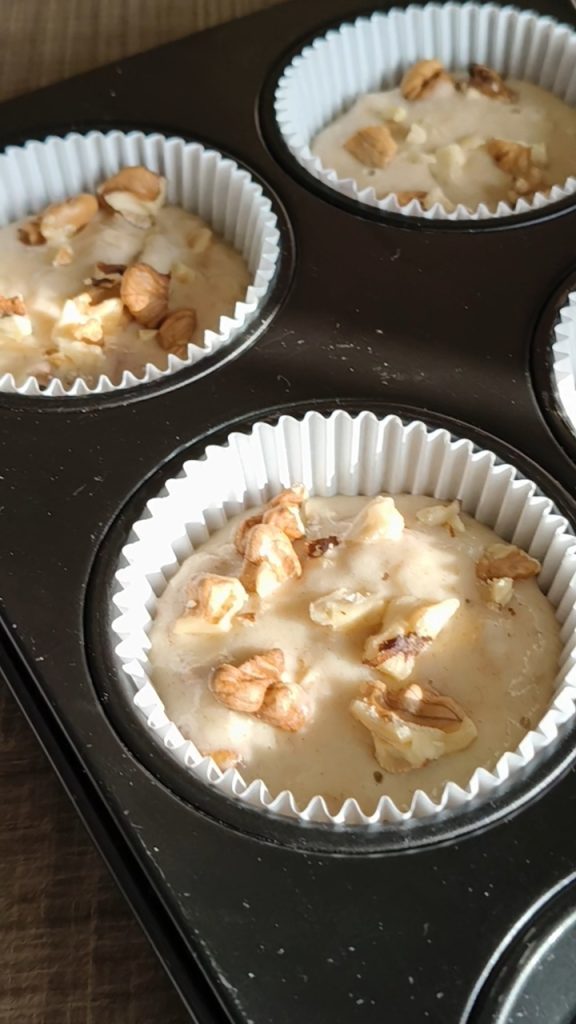 Line the muffin tin with paper liners, pour the batter into the molds and, if you like, decorate the top with a few walnut pieces. Bake for about 18/20 minutes (depends on your oven).