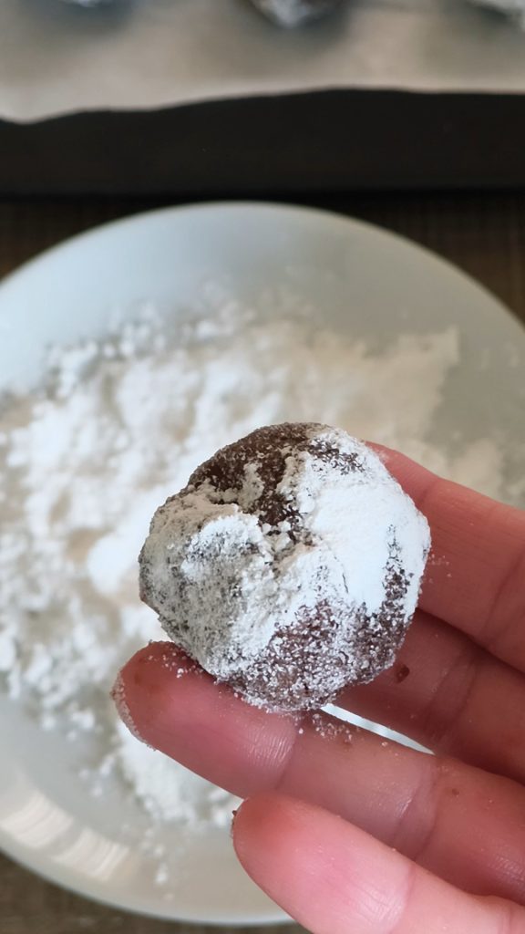 Roll the balls first in granulated sugar and then in powdered sugar (or just in powdered sugar).