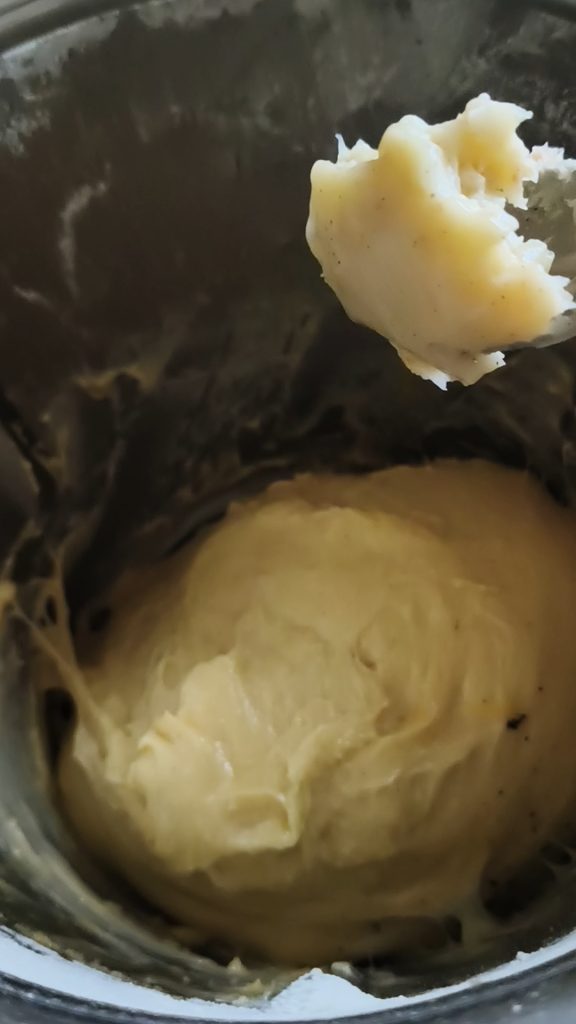• Add the yolks; 1 min./speed 3 (On average, a yolk weighs 20 g, but it’s not certain. Therefore, weigh 3 yolks and, if needed, crack an egg in a separate small bowl, separate the white and yolk, mix the yolk, and use the amount needed to reach 60 grams).