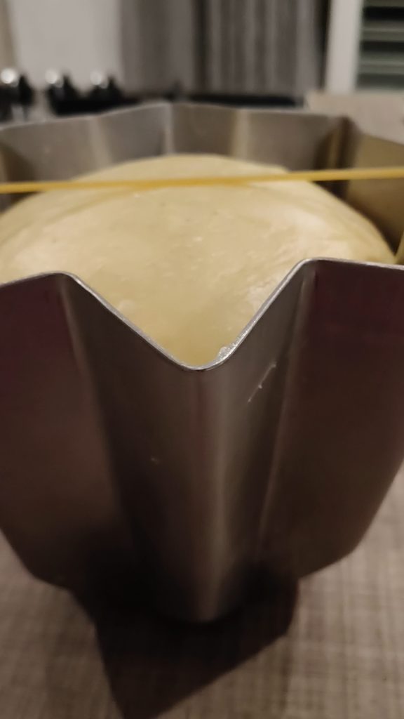 • To check the rising, place a spaghetti strand on the mold’s edge and cover with plastic wrap or a disposable shower cap (obviously unused). The rising can be done in the oven with the light off, making sure it doesn’t exceed 77/79°F (since there’s no natural yeast, it’s better not to exceed these temperatures).) The pandoro is ready to be baked when the dough reaches the spaghetti.
