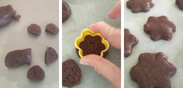 – Transfer the dough onto the pastry board, form logs, and cut them. You can leave them round and a bit irregular or use a cookie cutter. Place the cookies on a baking sheet lined with parchment paper.