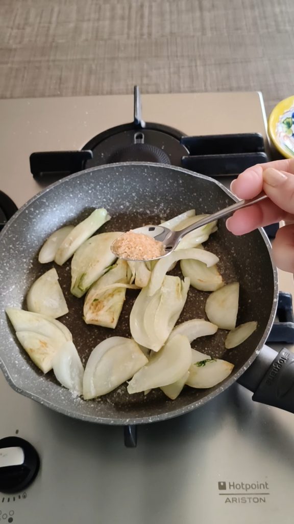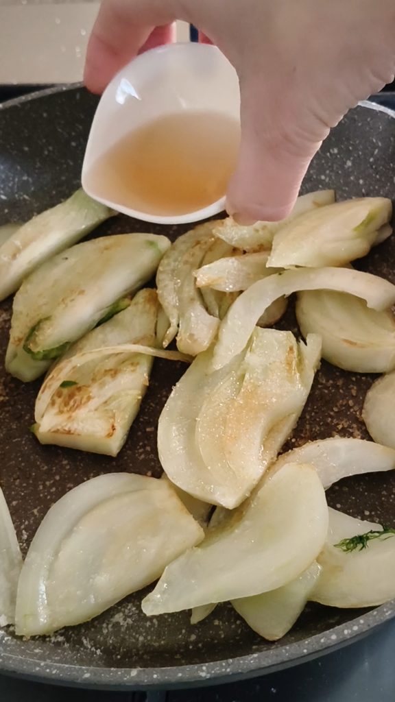 Pour the apple cider vinegar, let the alcohol evaporate, cover, and continue cooking until the fennel becomes tender (about 5 minutes; they should not become overly soft).