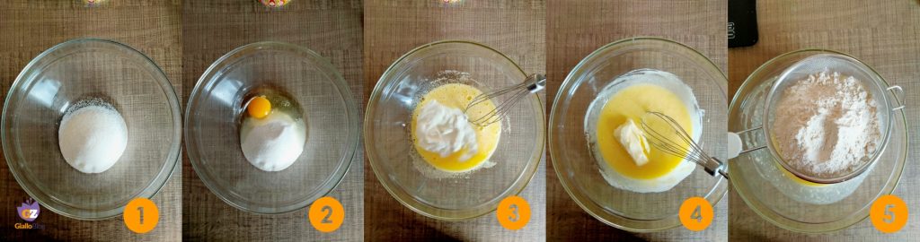 • – In a bowl, whisk together the sugar (1) with the egg (2); add the yogurt (3) and softened butter (4).