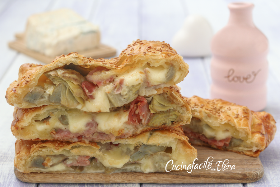 The artichoke rustic pie is a savory tart made of puff pastry with a creamy and stringy filling of speck, gorgonzola, and scamorza. I love artichokes and love them even more paired with speck and gorgonzola, so I used these ingredients to prepare a rustic pie that saves dinner, which we adored and devoured in 5 minutes! The artichoke rustic pie is a real delight, perfect as a main dish, appetizer, or second course, also great for an aperitif, it will be a hit!