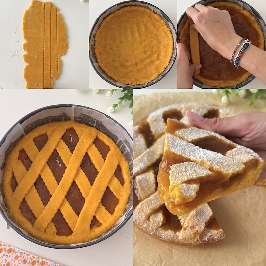• Fill the carrot tart with your preferred jam, place the strips on top (I made 7, placing 4 below and 3 on top), finish the edges, and bake the carrot and almond tart in a preheated oven at 350°F for about 35 minutes until golden.