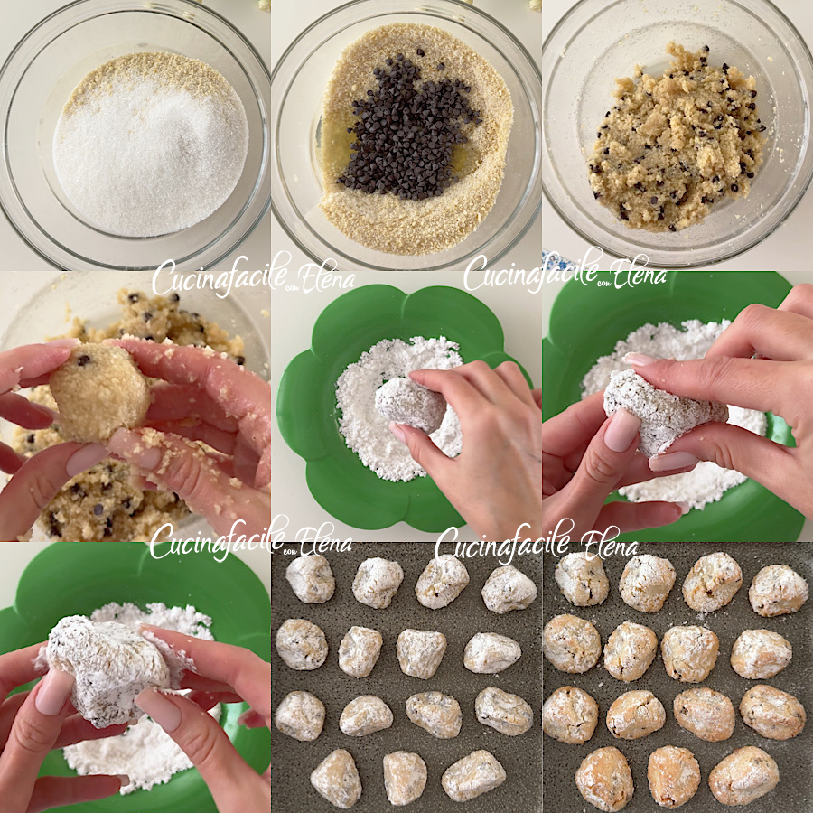 Take a bit of dough, form a ball, and roll it in powdered sugar, then pinch it with your thumb and index finger to make all the chocolate chip pinches this way.