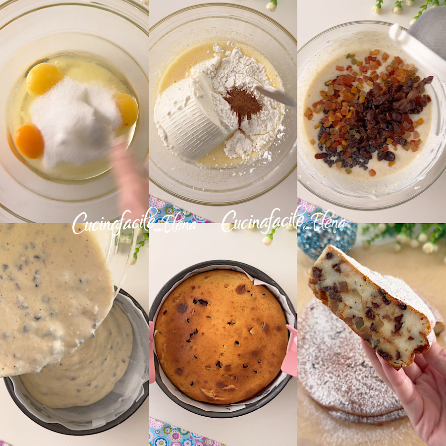 The Christmas gateau is very easy and quick to prepare. First, put the eggs, sugar, and vanilla in a bowl and mix with a fork. Add the ricotta, milk, cornstarch, and cinnamon, and mix all ingredients well. Incorporate the chocolate chips, candied fruits, and raisins previously soaked and well-drained, and mix.