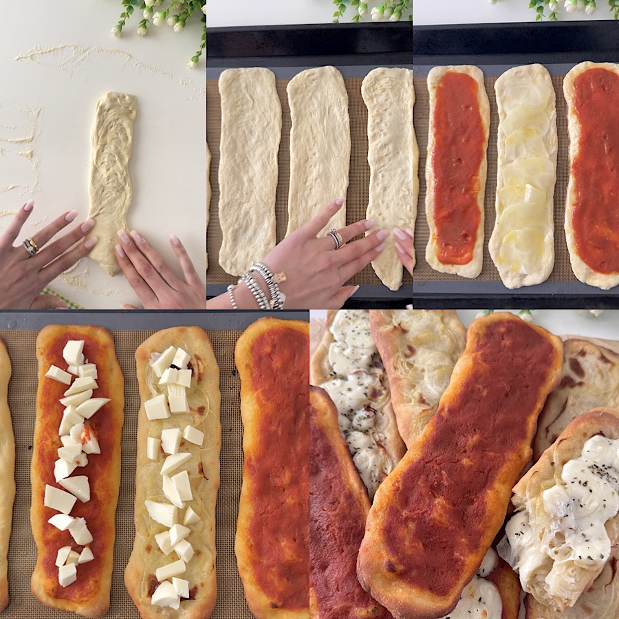 Top some of the pizza sticks with tomato sauce (seasoned with oil, salt, and pepper) and others with onions and potatoes sliced very thinly (using a mandoline, if you have one). Let them rise for another hour, season with a pinch of salt and a drizzle of oil, and bake in a preheated oven at 428°F for 15/20 minutes, until they are well golden.